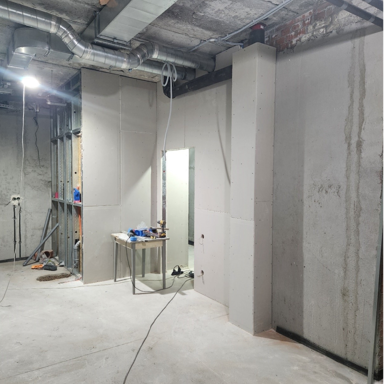 Сейчас на всех этажах кипит электромонтаж — от штробления стен до прокладки кабелей. На втором этаже монтируются новые перегородки, формируя будущие помещения. Одновременно с этим завершается устройство полов первого этажа и герметизация всех технологических отверстий для коммуникаций.